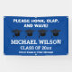 Añada a las festividades de graduación durante los tiempos del Coronavirus con esta por favor bocina y ondea felicitaciones bandera azul! Si no puedes tener una fiesta de graduación, ¡entonces haz un desfile de autos! Personalice con el nombre del graduado, el año de graduación, el nombre de la escuela u otros mensajes de personalizado.