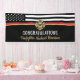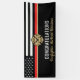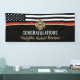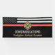 Este diseño cuenta con una bandera de bomberos con rayas blancas y negras y una delgada franja roja. "Felicitaciones" y la insignia de un bombero se sienta por encima del nombre del bombero que se graduó. Este diseño también funciona bien para los bomberos, lugartenientes o jefes que se retiran. ¡Celebren con estilo!