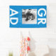 Banner de graduación de personalizado con "Grad" en letras en negrita y blanco con un fondo azul o color de su elección. Personalice el cartel de la graduación con fotos agregando el nombre del graduado, el nombre de la escuela y el año de graduación. ¡El banner de moda para graduarse es perfecto para mostrarse en tu fiesta de graduación de secundaria o universitaria!