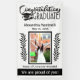 Este cartel es adecuado para graduados mujeres o hombres. Sube la foto de alta resolución de tu graduado e ingresa el nombre, la fecha y el nombre de la universidad o universidad a la que asististe. Cualquiera de los lados de la zona negra de la foto tiene hermosas hojas de laurel negras. El fondo del cartel dice "¡Estamos orgullosos de ti!" Esta frase se puede personalizar si prefiere una redacción diferente.