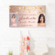 A banner for a girly and glamorous graduation party for two graduates. A faux rose gold, pink metallic looking background with an elegant faux gold stars dripping. Personalize and add your own 2 two photos of the graduate. Text; Congratulations. The text: Graduate, and the names are written with a modern hand lettered style script.