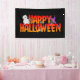 Cartel divertido de Halloween con un gráfico con las palabras "Feliz Halloween" e imágenes de una momia, arañas, telarañas y el gorra de una bruja, perfecto para una fiesta de Halloween.