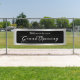 Gran banner de apertura de personalizable para su nueva pequeña empresa. El fondo presenta una gráfica satinada de Relieve metalizado gris plateado gris oscuro con un rectángulo negro. Se puede personalizar el estilo del tipo de letra y el color blanco grisáceo.