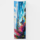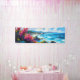 Amplia playa y rocas del Mediterráneo. Una pintoresca y estilizada acuarela ofrece una amplia vista de la costa, con olas azul turquesa y una playa de arena que se adentra a lo lejos. La playa está rodeada de acantilados bajos y de grandes rocas, con montañas lejanas y flores en primer plano en tonos rosa y amarillo que le dan un toque tranquilo y colorido.