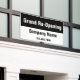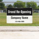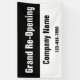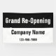Un banner le permite a todos saber que su negocio ha reabierto. El texto blanco de la parte superior dice 'Gran reapertura'. El texto blanco está en una franja negra. Una franja blanca en la parte inferior tiene texto negro para el nombre de negocio y el número de teléfono.