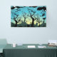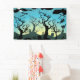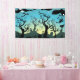 Diseño de pancartas en el jardín de infancia negro, aqua, Halloween amarillo, con un cementerio con árboles espeluznantes, tumbas, cruces, cráneos, una bruja, un búho, murciélagos, fantasmas y luna creciente y nubes sobre el fondo amarillo y turquesa.