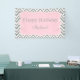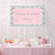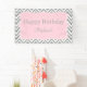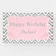 Patrón de chevron gris y blanco con banner de cumpleaños de acento rosa pastel. El zigzag gris y blanco y en el centro hay una forma de quatrefoil rosa pastel con el texto personalizado.