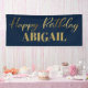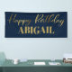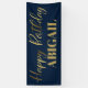 Banner fiesta azul marino y dorado "Feliz cumpleaños" personalizado con el nombre del invitado de honor.