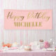 Elegante cartel fiesta rosa y dorado "Feliz cumpleaños" personalizado con el nombre del invitado de honor.