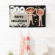 Un diseño de Halloween super lindo con un niño y un chica envueltos en vendas que actúan como momias egipcias. Están saliendo de un cementerio iluminado por una luna llena que tiene lápidas y la silueta de un murciélago negro que vuela sobre él. La palabra boo aparece encima de ellos en blanco sobre negro y tiene una cara kawaii divertida y una araña negra y amarilla encima. Pequeñas estrellas amarillas rodean a los niños. Este cartel divertido y llamativo dice "Halloween feliz" en la parte inferior y es ideal para todas las celebraciones de la fiesta de halloween infantil o fiestas de cumpleaños.