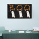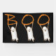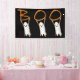 Pancarta personalizado "BOO" de fantasmas de Halloween con tres lindos fantasmas blancos sosteniendo la palabra "BOO" en naranja sobre fondo negro. Este diseño caprichoso es totalmente personalizable.