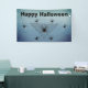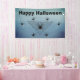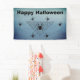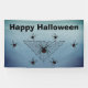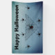This cloth event banner is a mix of shades in blue grey with a large black triangular spider web with poison black widow spiders who have the hourglass red mark. Customise the Happy Halloween text with the template.