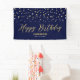Este sencillo diseño de banner de cumpleaños incluye elegantes letras de guión "Happy Birthday" con un fondo de confeti hexagonal. Decoración fiesta perfecta para una moderna fiesta de cumpleaños con temática azul marino y dorada. En mi tienda BaraBomDesign hay más invitaciones y suministros de fiesta a juego.