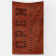 Personalizar este singular y llamativo banner de cuero marrón falso vegano Open Business con nombre de negocio y horas de funcionamiento. Diseño creado con 3 capas de tipografía audaz en diferentes matices para simular el aspecto grabado en relieve. Un cartel elegante y profesional para su negocio o escuela.