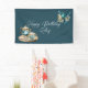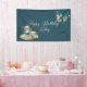 La pancarta Hummingbird Birthday Tea Fiesta da la bienvenida a su elegante fiesta con un set de té y colibrí sobre un fondo verde azulado.
