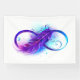 Símbolo de infinito con una hermosa pluma pintada en colores brillantes púrpura y azul sobre fondo blanco.