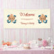 Este mostrador de recepción de bodas tibetanas presenta un tradicional nudo dorado de felicidad con cintas azules y un texto de bienvenida boda en un elegante guión con un fondo crema moderno.