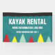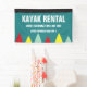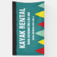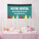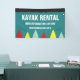 Anuncie su negocio de kayak o evento. Edite todo el texto a su información. Diseño de paleta de color retro con coloridos iconos kayak en la parte inferior de un fondo de agua del río.
