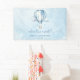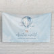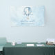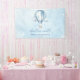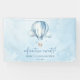 ¡Este es un banner de fiesta de bebé en globo aerostático azul La aventura espera!