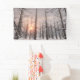 Un sol pálido del invierno fija detrás de árboles de alerce elevados como centinelas oscuros. Sus ramas gnarled, descubren a excepción de una polvoreda de la nieve, y los oros, los rosas, y los azules en colores pastel del cielo de la puesta del sol se ven como a través de una neblina soñadora. En primero plano los copos de nieve están cayendo suavemente.