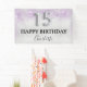 Elegante, clásico, glamuroso y jovencito para una fiesta de 15 años de Quinceañera. Un fondo falso plateado. Decorado con chispas de imitación de color lavanda. Personalice y agregue un nombre. Con el texto: Feliz cumpleaños. El nombre está escrito con un guión moderno de estilo con letras a mano de color negro. El número 15 se escribe con un tipo de letra de estilo globo. Se puede utilizar como una pancarta de bienvenida o como una decoración de pared fiesta.