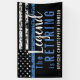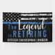 Este diseño presenta una bandera de la fuerza policial con franjas negras y blancas, y también una franja de línea azul delgada. El texto "La leyenda se jubila" se sitúa encima del nombre personalizable del oficial de la ley, alguacil, capitán o jefe que se jubila. ¡Celebre este hito con estilo!