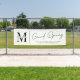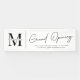 Banner al aire libre minimalista en blanco y negro para la gran apertura de negocios, que incluye espacio para su monograma o logotipo, nombre de negocio, dirección y detalles de contacto. La letra del guión, de moda, dice 'Grand Opening'. Una excelente manera de destacar y promocionar el lanzamiento de su nuevo negocio con este moderno banner logo de la empresa - utilizarla para su nueva boutique, salón de belleza, spa o tienda.