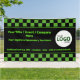 Un cheque verde con texto brillante para un ambiente cibernético, ideal para ferias de tecnología y conferencias de TI, pero también un gran captador de atención para cualquier línea de negocio. Rápidamente, sube tu pancarta subiendo tu logotipo y sumando hasta 3 líneas de texto personalizado.