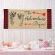 Banner de la ducha de bebé con unas huellas de bebé lindas sobre un papel Kraft y fondo de manto de búfalo. Se puede añadir texto para personalizar esta rústica aventura de leñador comienza con la pancarta de la ducha de bebé.