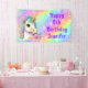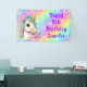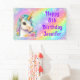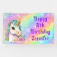 Este divertido banner de cumpleaños feliz presenta un mágico unicornio con una forma acuática y un cuerno dorado en un fondo de arcoiris. Diseñado en púrpura, lavanda y tintas con chispas purpurinoso y personalizado con tu nombre. ¡Perfecto para ese mágico fiesta de unicornio!