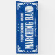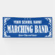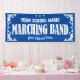 Banner del desfile de bandas de marcha para la escuela u organización con divertidos giros decorativos y estrellas bordean el blanco. Edite el texto para el nombre y la ciudad. Cambie el fondo azul a cualquier color.