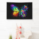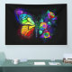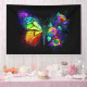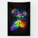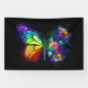 Arcoiris, mariposa monarca luminosa, pintada de forma artística con ramo de iridiscente, rosas brillantes y luminiscentes sobre fondo negro. Mariposa arcoiris.