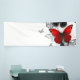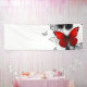 Montón de mariposas voladoras, realistas, rojas y negras morfo sobre fondo blanco con gotas de pintura.