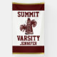 Bandera vertical temática de la animadora hecha en blanco, con una raya dorada y marrón, en el top y la parte inferior. Las ilustraciones gráficas marrón de un megáfono y de los poms del pom, adornan el centro de la bandera, con el texto marrón de encargo listo para personalizar. Las opciones para las banderas interiores o las banderas al aire libre con los ojales están disponibles.