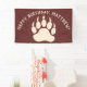 Esta pancarta personalizado es perfecta para fiestas de cumpleaños rústicas o eventos temáticos de camping. Presenta un fondo de color marrón con el ilustracion de un paño de oso con marfil y tu propio mensaje personalizado con letras de marfil.