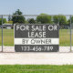Sencillo gris oscuro y blanco para la venta o alquiler por parte del propietario banner al aire libre que se puede personalizar con su texto o información personal. No importa si quieres vender un condo, una casa, una motocicleta, un auto, un bote o un avión. Este signo promocional puede ser visto fácilmente por clientes potenciales.