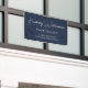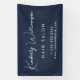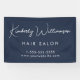Banner azul promocional de moda para su negocio con un ambiente minimalista que incluye su nombre de empresa o marca en un guión moderno de firma blanca y texto adicional debajo con letras simples en blanco.
