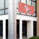 Lona Moda monogramada flor azul cardíaco rojo sobre ros