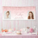 Bienvenidos invitados a la fiesta de graduación o simplemente anuncien su logro con esta pancarta de fotos glamorosa y moda, con un purpurina falso rosa brillante y un fondo sombrío rosado. Reemplace fácilmente las dos imágenes de muestra con fotos del graduado. Personalízalo con su nombre en polvoriento guión de escritura a mano rosa, con el año de clase y la escuela en letra sans serif. Perfecto para graduación de secundaria o universitaria.