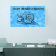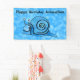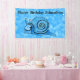 Esta bandera del paño es una mezcla de azules ligeros y oscuros con un caracol sonriente del dibujo animado lindo con los ojos del blanco un cuerpo y una cáscara modelados azul. Modifique el texto del feliz cumpleaños para requisitos particulares y nómbrelo con la plantilla.