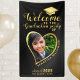 Crea una pancarta única de bienvenida personalizada para una fiesta de graduación diseñada en colores negro y dorado, decorada con el ilustracion de la gorra del graduado y una foto en forma de corazón en un marco amarillo dorado. Este diseño de plantilla facilita el personalizar con su propia foto, nombre y apellido, año y nombre de la escuela. En este diseño, el fondo negro imita ligeramente la superficie metálica.