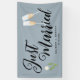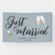 El moderno Banner de la recepción de la boda es un sencillo banner azul para tu fiesta de la recepción nupcial. Este elegante diseño "Just Married" es un divertido complemento al coche de escape de la pareja. La decoración boda se completa con tulipanes florales y copas de champán. Personalizar con el nombre de la novia y del novio y la fecha boda de la fiesta nupcial.