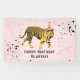 Llamar a todos los animales fiestas tema de cumpleaños con ilustracion de tigre rugiendo usando un gorra fiesta rosa con fondo rosa y diseño de bandeja de pintura negra.