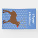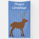 Este impresionante cartel presenta una imagen de diseño gráfico de un lindo reno Navidad con una brillante nariz roja brillante. El reno es marrón y peludo, tiene grandes cuervos y cascos marrones oscuros. Su ojo es negro y ella tiene una gran sonrisa en su cara. Hay copos de nieve alrededor del reno y el fondo es azul.