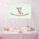 Pancarta de navidades con el ilustracion de un adorable venado. Ojos grandes orejas grandes con una cabeza grande y pequeñas cuerdas marrones. Con un gran arco rojo. Junto a un montón de regalos.