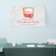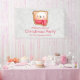 Una pancarta de un fiesta Navidad con una cara adorable y adorable de oso puesta en una base de galletas. Llevando una bufanda de rayas rojas y blancas. El fondo es un patrón que tiene el aspecto de caída de la nieve, en plata y blanco.