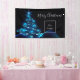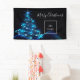 Banner de moda y moderno para Navidades de su empresa, negocios en blanco, negro y azul. Un fondo negro con un brillante árbol de Navidad azul purpurinoso decorado con estrellas. Con el texto: Feliz Navidad escrito con el moderno y moderno guión de gran estilo con letras a mano blanca. Plantillas para su empresa, logotipo comercial.