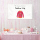 Una pancarta para una divertida temporada de vacaciones y Navidades fiestas, cenas. Un fondo blanco moda. Decorada con un desagradable suéter rojo, blanco, naranja y verde navideño. Personalice y agregue su nombre de familia, letras negras. El texto: Fiesta de Navidades está escrito con un guión moderno de estilo con letras a mano. Se puede utilizar como señal de bienvenida o decoración de pared fiesta