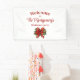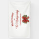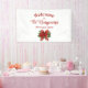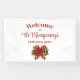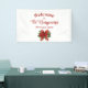 Cartel con Navidades festivos inclinados en rojo y oro. Rodeado de flores de poinsettia, pino y decoración navideña.