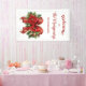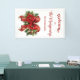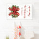 Cartel con Navidades festivos inclinados en rojo y oro. Rodeado de flores de poinsettia, pino y decoración navideña.